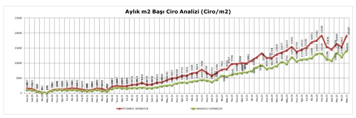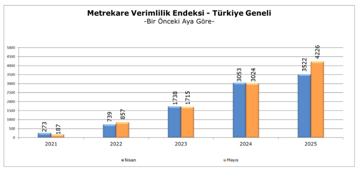 Mayıs 2025 döneminde metrekare verimlilik endeksi, Nisan 2025 dönemi ile karşılaştırıldığında ve enflasyondan arındırılmadan incelendiğinde yüzde 20 oranında yükseliş göstererek 4226 puana yükselmiştir.