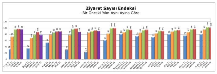 Mayıs 2025 verileri bir önceki yılın aynı ayı ile karşılaştırıldığında ziyaret sayısı endeksinde yüzde -2 oranında azalış görülmüştür.