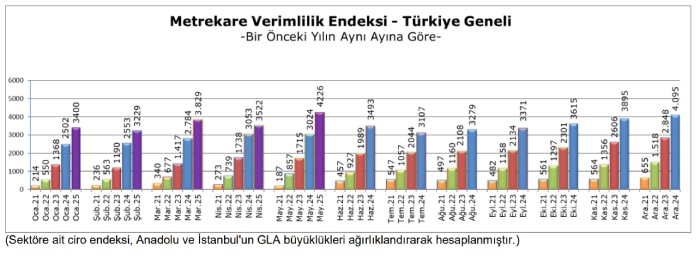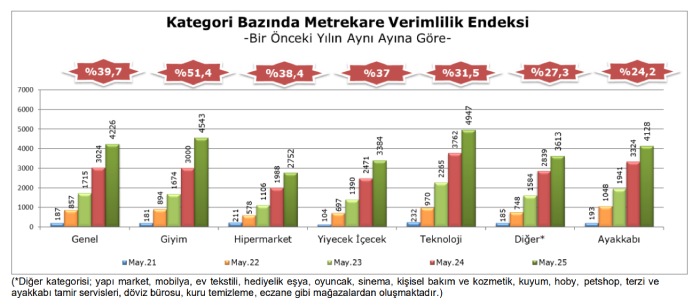 Mayıs 2025 döneminde kategoriler bazında metrekare verimlilik endeksi, Nisan 2025 dönemi ile karşılaştırıldığında ve enflasyondan arındırılmadan incelendiğinde; ayakkabı kategorisinde yüzde 29,3, giyim kategorisinde yüzde 29,1, diğer kategorisinde yüzde 15,7, hipermarket kategorisinde yüzde 8,6, teknoloji kategorisinde yüzde 7,2 ve yiyecek içecek kategorisinde yüzde 6,6 oranında bir yükseliş yaşandığı görülmektedir.