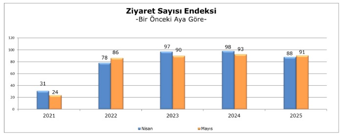 Mayıs 2025 döneminde ziyaret sayısı endeksi bir önceki ay Nisan 2025 ile karşılaştırıldığında yüzde 3 oranında bir yükseliş olduğu gözlemlendi.