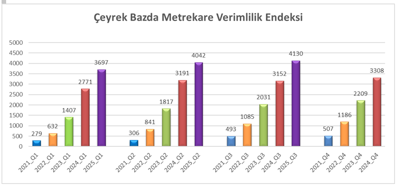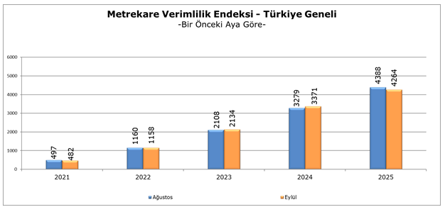 Eylül 2025 döneminde metrekare verimlilik endeksi, Ağustos 2025 dönemi ile karşılaştırıldığında ve enflasyondan arındırılmadan incelendiğinde yüzde -2,8 oranında azalış göstererek 4264 puana düşmüştür.
