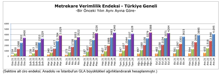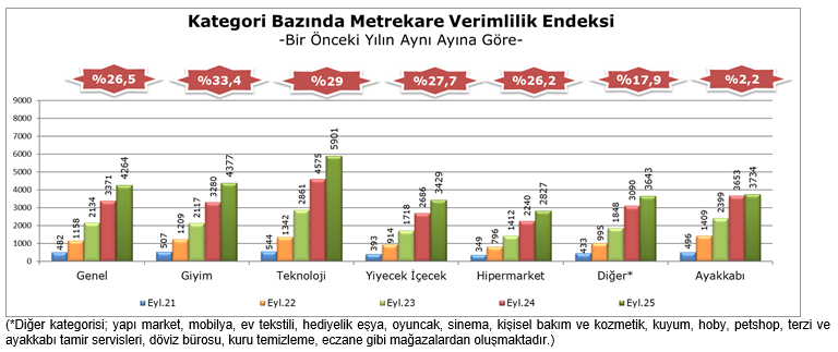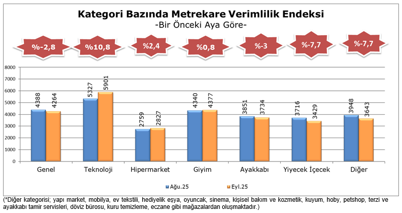 Eylül 2025 döneminde kategoriler bazında metrekare verimlilik endeksi, Ağustos 2025 dönemi ile karşılaştırıldığında ve enflasyondan arındırılmadan incelendiğinde; teknoloji kategorisinde yüzde 10,8, hipermarket kategorisinde yüzde 2,4, giyim kategorisinde yüzde 0,8’lik artış görülürken ayakkabı kategorisinde yüzde -3, yiyecek içecek kategorisinde yüzde -7,7 ve diğer kategorisinde yüzde -7,7’lik azalış yaşandığı görülmektedir.