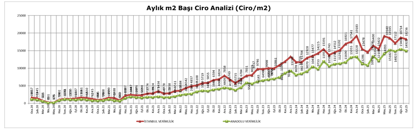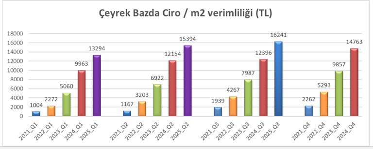 Çeyrek bazlı m2 başına düşen cirolarda üçüncü çeyrekte bir önceki yılın aynı dönemi ile karşılaştırıldığında ve enflasyondan arındırılmadan incelendiğinde yüzde 31’lik bir artış yaşanmıştır. 2025 yılı üçüncü çeyrekte metrekare verimliliği 16.241 TL şeklinde gerçekleşti.