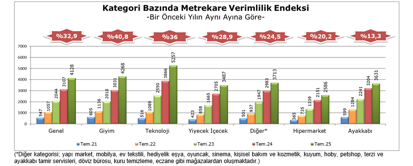 Temmuz 2025 döneminde kategoriler bazında metrekare verimlilik endeksi, Haziran 2025 dönemi ile karşılaştırıldığında ve enflasyondan arındırılmadan incelendiğinde; teknoloji kategorisinde yüzde 4, diğer kategorisinde yüzde 3,8, yiyecek içecek kategorisinde yüzde 1,5’lik artış görülürken hipermarket kategorisinde yüzde -1,7, giyim kategorisinde yüzde -11,1 ve ayakkabı kategorisinde yüzde -13,2’lik bir azalış yaşandığı görülmektedir.