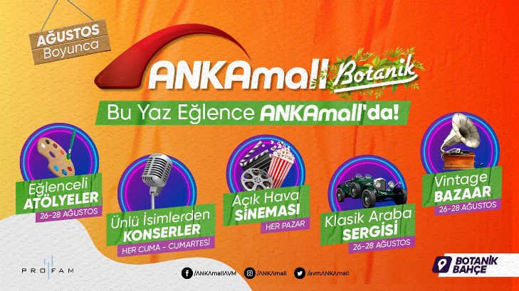 PROFAM tarafından yönetilen, Türkiye’nin en büyük ve gözde alışveriş merkezlerinden biri olan ANKAmall, ziyaretçilerini ağustos ayında müzik, sanat ve eğlence dolu etkinliklerle karşılamaya hazırlanıyor.