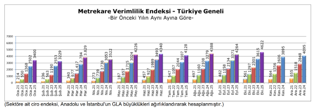 Her ay düzenli olarak yayınlanan verilere göre ciro endeksi, Ekim 2025 döneminde, bir önceki yılın aynı ayı ile karşılaştırıldığında ve enflasyondan arındırılmamış olarak incelendiğinde yüzde 27,9 oranında artarak 4622 puana yükseldi. Ancak, Ekim 2025 için açıklanan yıllık enflasyon oranının yüzde 32,87 olduğu dikkate alındığında, metrekare verimlilik endeksindeki artışın enflasyonun altında kaldığı görülüyor.
