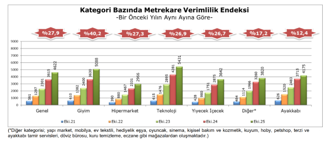 Ekim 2025 döneminde kategoriler bazında metrekare verimlilik endeksi, Eylül 2025 dönemi ile karşılaştırıldığında ve enflasyondan arındırılmadan incelendiğinde; giyim kategorisinde yüzde 16,2, ayakkabı kategorisinde yüzde 11,8, yiyecek içecek kategorisinde yüzde 6,2, hipermarket kategorisinde yüzde 4,9 ve diğer kategorisinde yüzde 4,9’luk artış görülürken teknoloji kategorisinde yüzde -8’lik azalış yaşandığı görülmektedir.