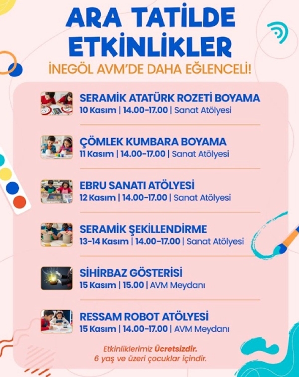 15 Kasım’da ise Sihirbaz Gösterisi ve Ressam Robot Atölyesi ile AVM Meydanı’nda eğlence doruğa çıkacak. Etkinlikler ücretsiz olarak düzenleniyor ve atölye çalışmalarına 6 yaş ve üzeri tüm çocuklar katılım sağlayabiliyor.
