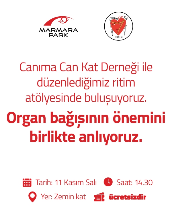 11 Kasım Salı günü saat 14.30’da Marmara Park AVM’nin zemin katında yapılacak atölyede çocuklar ritim duygularını keşfederken, aileler de organ bağışının yaşama kattığı degere dair farkındalık kazanacak.