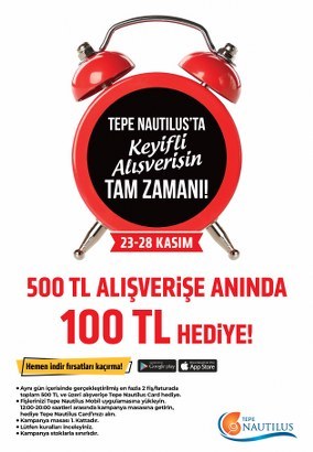 Merakla beklenen kampanya günlerinde harcadıkça kazanmak isteyenler Tepe Nautilus’a geliyor. Tepe Nautilus Mobil Uygulama üzerinden 23- 28 Kasım tarihlerinde, aynı gün içinde en fazla iki fiş & faturada 500 TL ve üzeri alışveriş yapan ziyaretçiler, 100 TL yüklü Tepe Nautilus Card’ın sahibi oluyor.