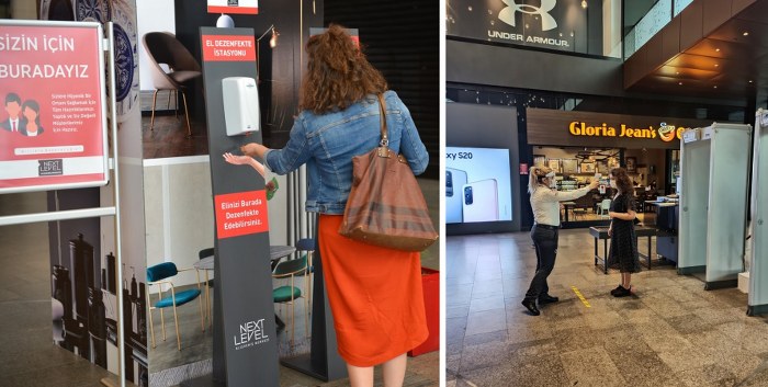 Girişler vücut ısısı ölçümü yapılarak maske zorunluluğu ile sağlanırken, içeride sık sık maske kontrolü de yapılıyor. Artırılan hijyen çalışmaları kapsamında asansör, ATM’ler, yürüyen merdivenler, X-ray cihazları, ortak kullanım alanları ve tuvaletler sık aralıklarla dezenfekte ediliyor.