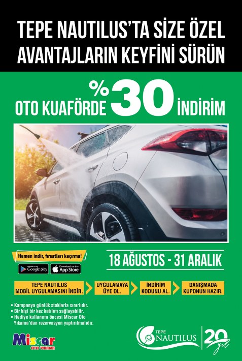 Tepe Nautilus, 18 Ağustos – 31 Aralık tarihleri arasında Tepe Nautilus mobil uygulamasını indiren ve üye olan ziyaretçilerine Miscar Oto Yıkama’da geçerli yüzde 30 indirim kazandırıyor.