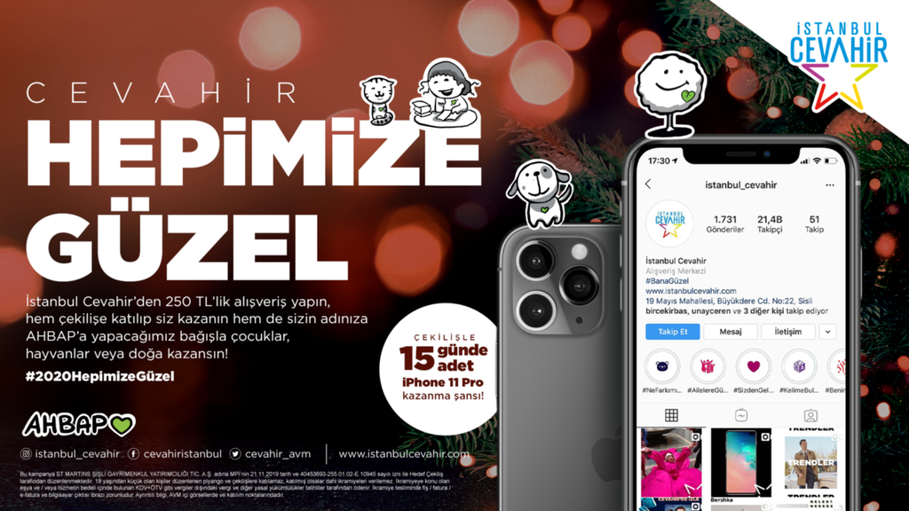 Ziyaretçiler, alışveriş merkezinin kayıt noktasında çekilişe katılarak 15 günde 15 adet iPhone 11 Pro kazanma fırsatının yanında Ahbap Derneği işbirliğiyle iyiliğe ortak olacak.