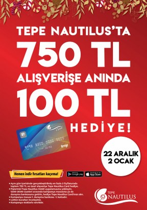 Tepe Nautilus Mobil Uygulaması üzerinden 22 Aralık -2 Ocak tarihleri arasında aynı gün içerisinde en fazla iki fiş & faturada 750 TL ve üzeri alışveriş yapan ziyaretçilere, 100 TL yüklü Tepe Nautilus Card hediye ediyor.