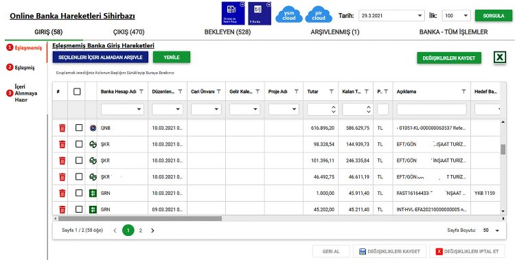 E-Banka modülünde sistem, müşteri ve tedarikçiyi yani cari hesabı VKN ve IBAN numarasından otomatik tanıyor, banka hesabını da otomatik buluyor. Sistem otomatik eşleştirme yapmasının yanı sıra kullanıcıya da bu esnekliği veriyor.