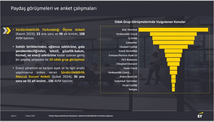 Sevin açıklamasının devamında ise, “Bu çalışma kapsamında farklı odak gruplarını temsilen 10 odak grup görüşmesine ilaveten 36 ana soru ve 55 alt kırılım sorusundan oluşan ve 106 paydaşın katıldığı anket çalışması gerçekleştirildi ve sektörün mevcut sürdürülebilirlik uygulamaları ile yaklaşımı değerlendirildi.
