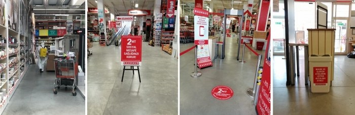 Mağaza girişlerinden itibaren iç alanlar, reyonlar ve kasalarda izolasyon gereği ziyaretçiler arasında 2 metre sosyal mesafe olması için mağaza zeminleri başta olmak üzere görsel uyarı levhaları da hazırlanmıştır.