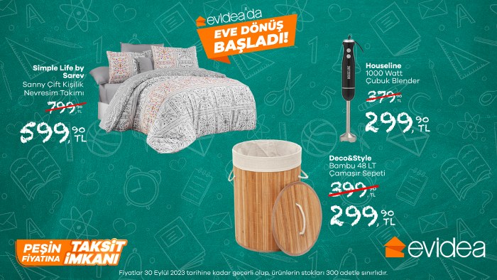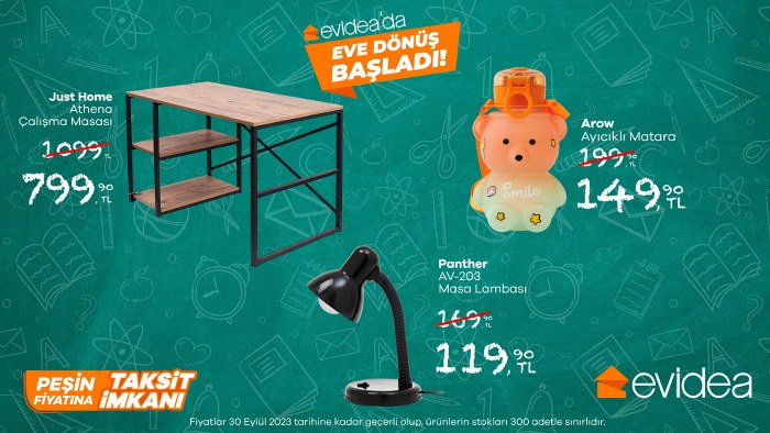 Evidea’nın back to school dönemine özel ürün gamında defter, kalem, tablet gibi tüketicilerinin talepleri olan ürünlere de yer verdiği görülüyor.