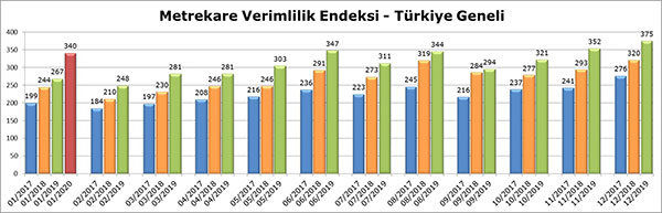 Ocak 2020 döneminde bir önceki yılın aynı ayı ile karşılaştırıldığında ve enflasyondan arındırılmadan incelendiğinde yüzde 27,3 oranında artış kaydederek 340 puana ulaştı.