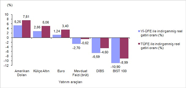 Yİ-ÜFE ile indirgendiğinde; yatırım araçlarından külçe altın %2,86 ve Euro %1,24 oranında yatırımcısına kazandırırken; mevduat faizi (brüt) %2,70, devlet iç borçlanma senetleri (DİBS) %6,59 ve BIST 100 endeksi %10,90 oranında yatırımcısına kaybettirdi. TÜFE ile indirgendiğinde ise külçe altın %5,06 ve Euro %3,40 oranında yatırımcısına kazandırırken; mevduat faizi (brüt) %0,62, DİBS %4,60 ve BIST 100 endeksi %8,99 oranında yatırımcısına kaybettirdi.