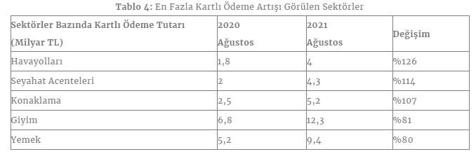 Kartlı ödemelerde, 2021 yılının ağustos ayında geçen yılın aynı dönemine göre en fazla artışın hangi sektörlerde gerçekleştiği detaylı incelendiğinde, “havayolları”nın yüzde 126 ile en fazla artış gerçekleşen sektör olduğu görüldü.