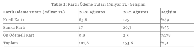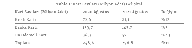 2020 yılının ağustos ayı ile kıyaslandığında kredi kartı adedinde yüzde 12'lik, banka kartı adedinde yüzde 3'lük, ön ödemeli kart adedinde ise yüzde 43'lük artış yaşandı. Toplam kart sayısı ise geçen yılın aynı dönemine göre yüzde 11 oranında artış göstererek 276,8 milyon adede ulaştı.