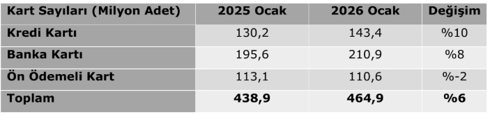 · 2025 yılının Ocak ayı ile kıyaslandığında kredi kartı adedinde yüzde 10’luk, banka kartı adedinde yüzde 8’lik artış, ön ödemeli kart adedinde ise yüzde 2’lik düşüş yaşandı.