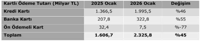 · Kredi kartları, banka kartları ve ön ödemeli kartlar ile Ocak ayında yapılan toplam ödeme tutarı bir önceki yılın aynı dönemine göre yüzde 45 artarak 2.325,8 milyar TL oldu.