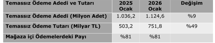 · Kartlarla yapılan temassız ödeme adedi geçen yılın aynı dönemine göre yüzde 9 artarak 1.124,6 milyon adet oldu. Temassız ödeme tutarı ise geçen yılın aynı dönemine göre yüzde 49 artarak 751,8 milyar TL oldu. Ocak ayında mağaza içi yapılan her 5 kartlı ödemeden 4’ü temassız gerçekleşti.