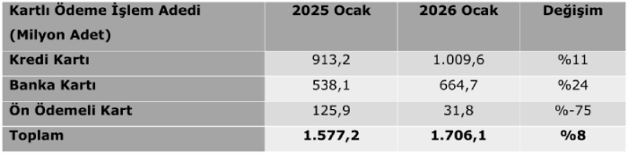 · Kredi kartları, banka kartları ve ön ödemeli kartlar ile Ocak ayında yapılan toplam ödeme adedi bir önceki yılın aynı dönemine göre yüzde 8 artarak 1,7 milyar adet oldu.