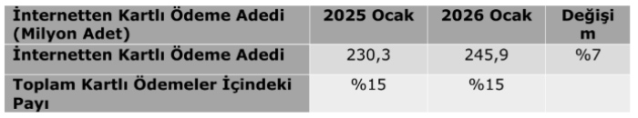 · İnternetten kartlı ödeme adedi, geçen yılın aynı dönemine göre yüzde 7 artarak 245,9 milyon adede yükseldi. İnternetten yapılan kartlı ödemelerin toplam içindeki payı ise yüzde 15’tir.