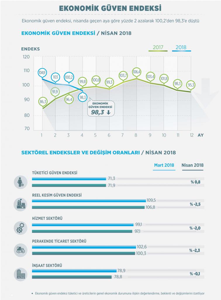 TÜİK verilerine göre ekonomik güven endeksi Nisan ayında bir önceki aya göre %2 oranında azalarak 100,2 değerinden 98,3 değerine düştü. Ekonomik güven endeksindeki düşüş, reel kesim (imalat sanayi), hizmet, perakende ticaret ve inşaat sektörü güven endekslerindeki düşüşlerden kaynaklandı.