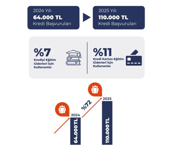 “Okul dönemi öncesinde kredi başvurularında gözlemlediğimiz yüzde 72'lik artış, enflasyonun çok üzerinde gerçekleşti. Bu tablo, ailelerin eğitim harcamalarını karşılayabilmek için krediye geçen yıla oranla daha yoğun şekilde yöneldiğini ortaya koyuyor.