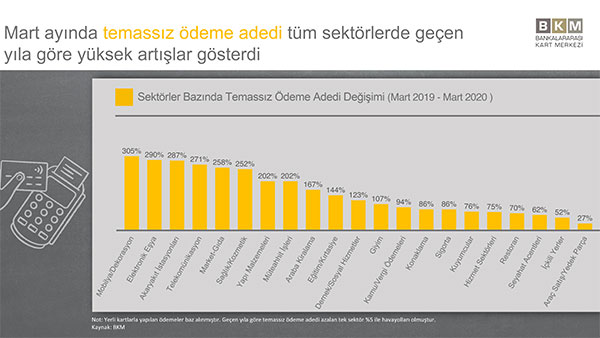 Temassız ödemeler özellikle sosyal izolasyon sürecinin başladığı mart ayının ikinci haftasında zirve yaparken, en fazla temassız ödeme yapılan sektörler market, restoran ve sağlık/kozmetik oldu.