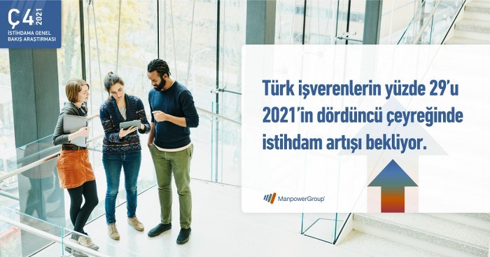 1.011 Türk işverenin görüşlerine baş vurularak yapılan araştırmanın verilerine göre Türk işverenlerin yüzde 29'u 2021'in dördüncü çeyreğinde istihdam artışı beklerken, yüzde 14'ü azalma öngörüyor ve yüzde 52'si ise değişiklik olmayacağını tahmin ediyor.