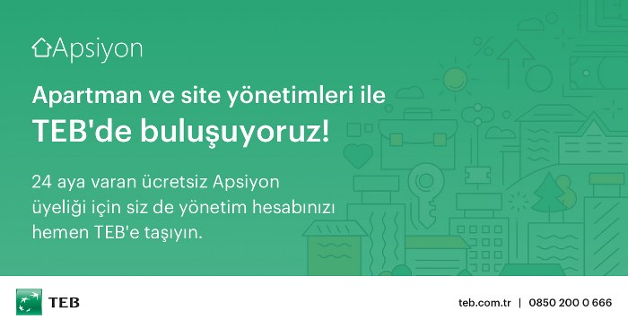 'Site Yöneticisinin Dijital Asistanı’ sloganıyla 2012 yılından bu yana hizmet veren Apsiyon, Türk Ekonomi Bankası (TEB) ile yapılan iş birliği kapsamında, apartman ve site yönetimleri için 24 aya varan ücretsiz Apsiyon üyeliği kampanyası başlattı.