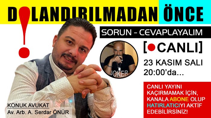İçerik üretici Joker Abdul ile Av. Arb. Abdullah Serdar Önür bu akşam, Youtube.com/JokerAbdul kanalında, katılımcılarla soru-cevap şeklinde ilerleyecek olan, “Dolandırıcılara geçit yok!” başlıklı interaktif bir canlı yayın gerçekleştirecek.