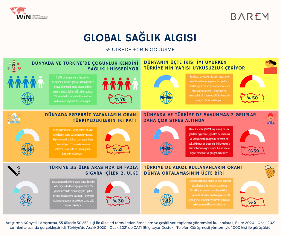 BAREM’in global ortağı WIN Grubu ile birlikte 35 ülkede gerçekleştirdiği Sağlık Araştırması, pandeminin yol açtığı tüm olumsuzluklara rağmen dünyada beş kişiden dördünün kendini sağlıklı hissettiğini ortaya koyuyor.