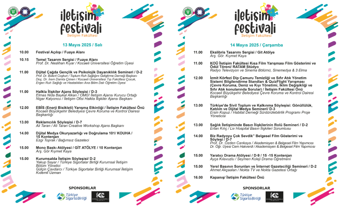 13-14 Mayıs tarihleri arasında Türkiye Sigorta Birliği ve Kürşat Çakıroğlu İnşaat sponsorluğunda düzenlenecek etkinlik, öğrencilerin sektördeki uzman isimlerle bir araya gelerek bilgi ve deneyimlerini artırmalarına, yaratıcılıklarını geliştirmelerine ve mesleki yetkinliklerini kazanmalarına olanak tanımayı amaçlıyor. Festival kapsamında, iletişim sektörünün çeşitli alanlarından profesyonellerin katılımıyla söyleşiler, seminerler, atölye çalışmaları gerçekleştirilecek.