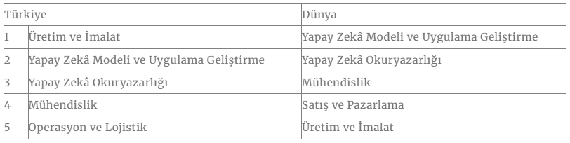 Yapay zekâ model ve uygulama geliştirme ile yapay zekâ okuryazarlığı küresel ölçekte bulunması en zor beceriler sıralamasında ilk sıraya yerleşti. Türkiye'de iş dünyasının bulmakta en zorlandığı teknik beceriler listesinin başında üretim ve imalat yer alırken, bunu yapay zekâ modeli ve uygulaması geliştirme ile yapay zekâ okuryazarlığı takip etti.