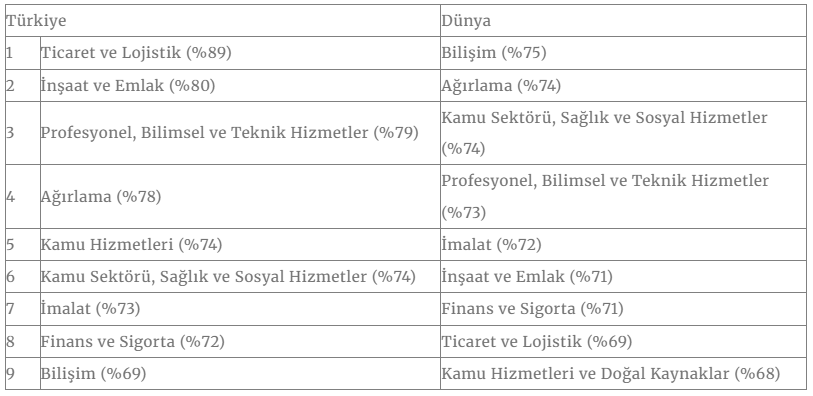 Küresel Yetenek Açığı Araştırması'nda sektörlere göre yetenek açığına bakıldığında ise Türkiye'de ticaret ve lojistik en fazla yeteneğe ihtiyaç duyulan sektör olurken bilişim yetenek açığının en az olduğu sektör oldu. Buna karşın bilişim, küresel yetenek açığında ilk sırada, ticaret ve lojistik 8. sırada yer aldı.