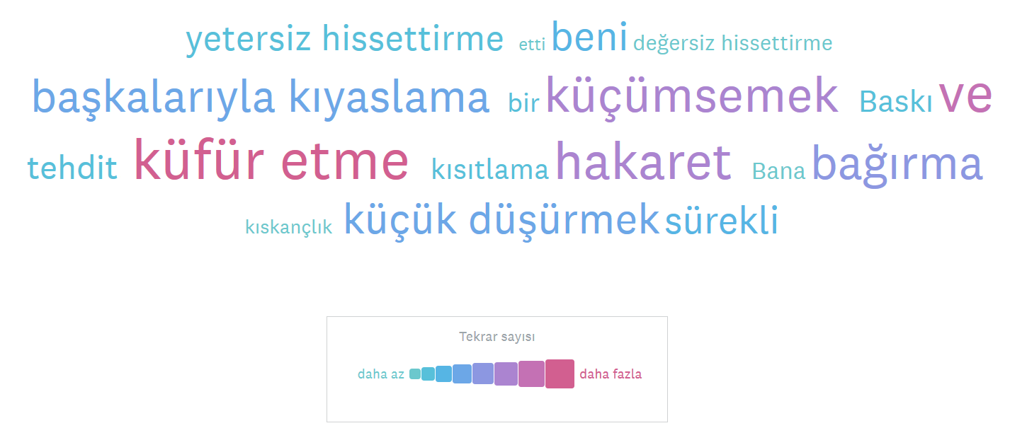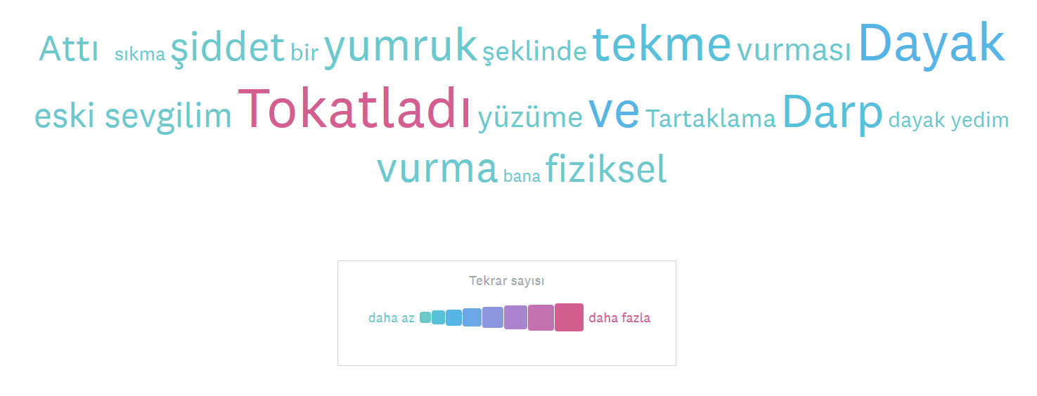 Fiziksel şiddete maruz kalan katılımcılara yaşadığı durumu kısaca anlatmalarını istediğimizde en çok uygulanan fiziksel şiddetin tokat olduğunu görüyoruz. “Ve” kelimesinin oldukça sık kullanılması birden fazla şekilde şiddete maruz kalındığını da gösteriyor. Ayrıca araştırmanın bütününe baktığımızda görüyoruz ki fiziksel şiddetle beraber psikolojik şiddet de oldukça sık uygulanıyor.
