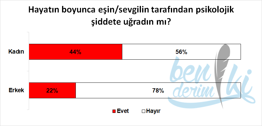 Erkeklerin %22’si eşinden veya sevgilisinden hayatında en az bir defa psikolojik şiddet gördüğünü belirtirken, psikolojik şiddet uyguladığını belirten kadınların oranı %16.
