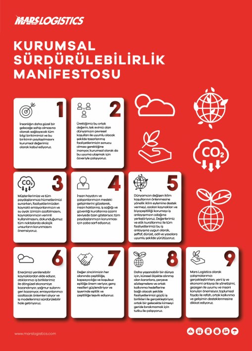 Çevresel, ekonomik ve sosyal sürdürülebilirliğe önem veren ve bu konularda çalışmalar yapan Türkiye’nin önde gelen lojistik şirketlerinden Mars Logistics, Kurumsal Sürdürülebilirlik Manifestosu’nu yayınladı.