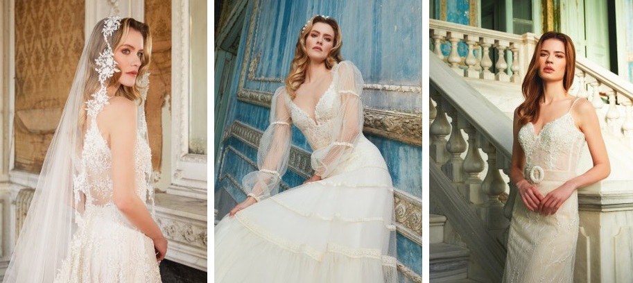Bir modelde birbirinden farklı iki veya üç dantel kullanılması, transparan büstiyerler, kapuçino ve blash yansıyan renkler , uzun balon ve fırfır kollar, eteklerde ve kuyruklarda fırfır detaylar da 90’ların ruhunu taşıyan özgür gelinlere sesleniyor.