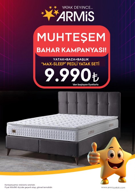 Baharın tazeliğini ve dinamizmini hissettirecek çok özel bir kampanya başlatan Armis, yatak+ baza+ başlıktan oluşan Max Sleep Pedli Yatak Seti’ni 9.990 TL’den satışa sunuyor.
