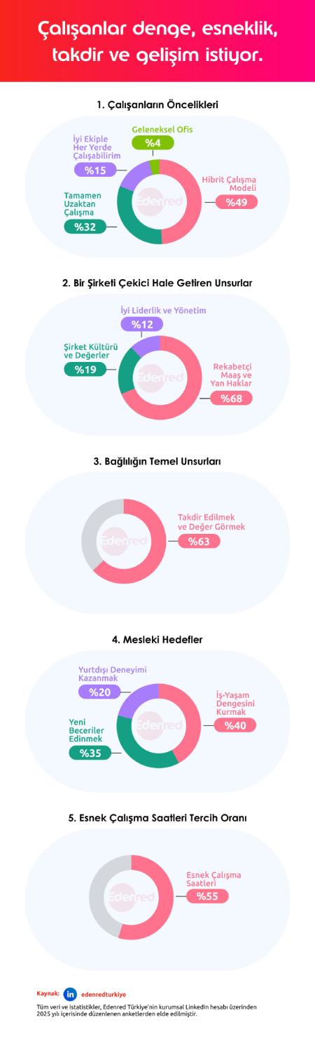 Anket sonuçlarına göre çalışanların öncelik sıralaması; hibrit çalışma, rekabetçi maaş ve yan haklar, takdir edilmek ve değer görmek, iş-yaşam dengesini sağlamak, esnek çalışma saatleri olarak belirlendi.