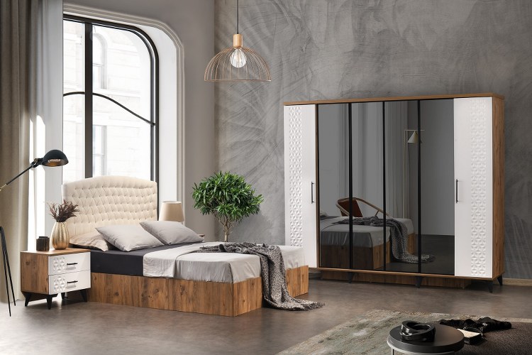 Modellerinde göze çarpan işçilik detaylarıyla benzersizleşen Castor Mobilya’nın Efes Yatak Odası Takımı, koyu renk cam aynalı ve beyaz dolap kapaklı gardobu ile şıklığı yansıtıyor.