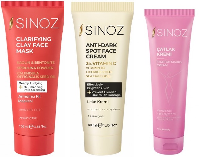Sinoz Leke Kremi, ciltte oluşabilecek lekelere karşı koruma bariyeri oluşturarak ten rengi uyumsuzluklarına engel olurken, Sinoz Arındırıcı Peeling, içeriğindeki arındırıcı mikro tanecikler ile tıkanık gözeneklerle mücadele etmeye yardımcı oluyor.