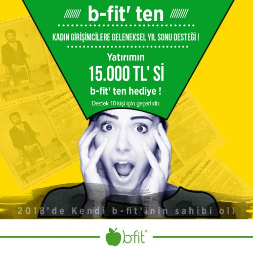 b-fit'in 2018 yılı bitmeden kendi işinin sahibi olmak isteyen kadınlara bir sürprizi de var! Geleneksel yıl sonu desteği ile 10 girişimciye franchise bedelinde 15.000 TL indirim sunulacak. Malzeme paketiyle birlikte toplam 70.354 TL olan franchise bedeli yıl sonu fırsatıyla 55.324 TL'ye düşüyor.